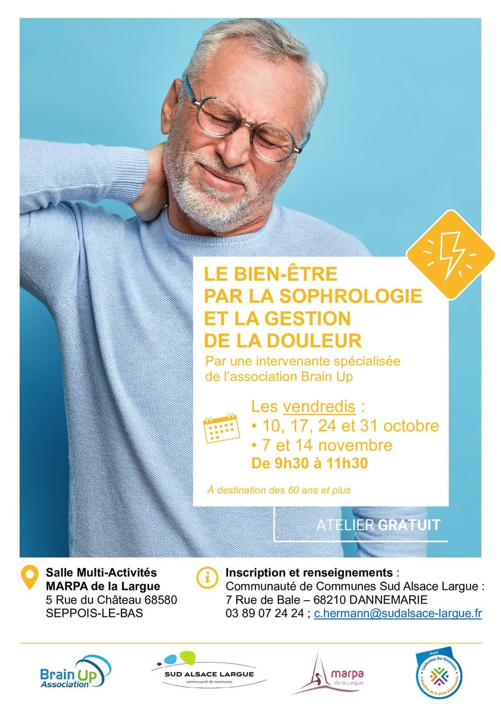 Venez partager un moment convivial et enrichissant autour de l’identification et la connaissance des mécanismes de la douleur, apprendre à la soulager avec notamment la pratique de la sophrologie, encadrés par une psychologue et une sophrologue.