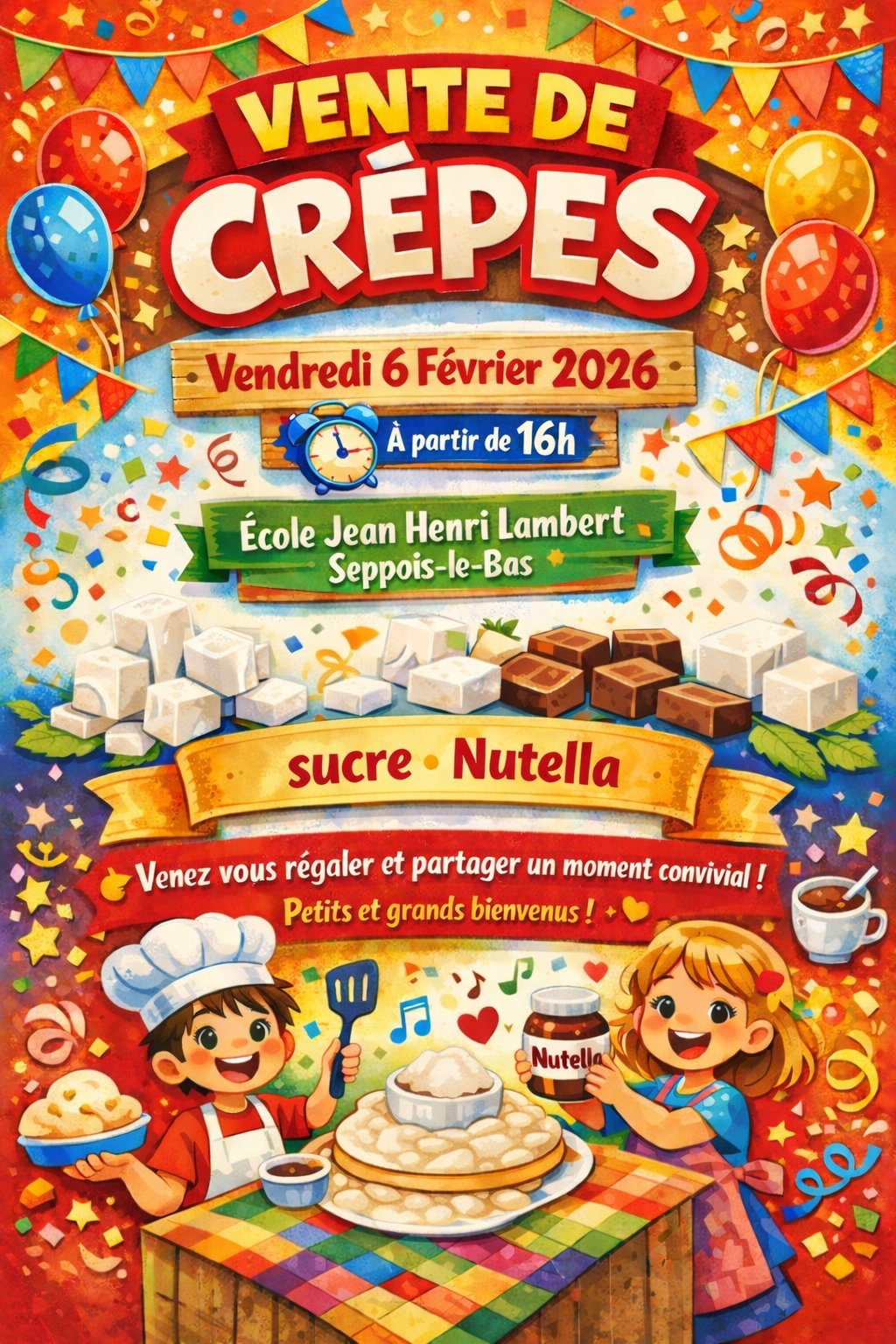 L'association scolaire "Les Petits Seppoisiens" organise une vente de crêpes le vendredi 6 février 2026 devant l'école JH Lambert.